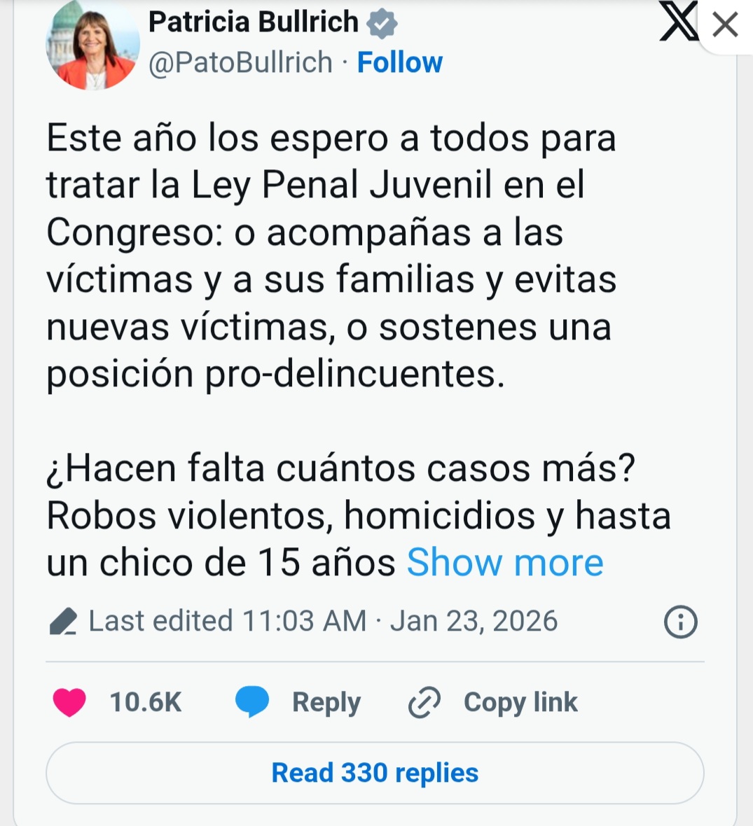 De esa manera es que en redes sociales expresó: “Este año los espero a todos para tratar la Ley Penal Juvenil en el Congreso: o acompañas a las víctimas y a sus familias y evitas nuevas víctimas, o sostenes una posición pro-delincuentes”.