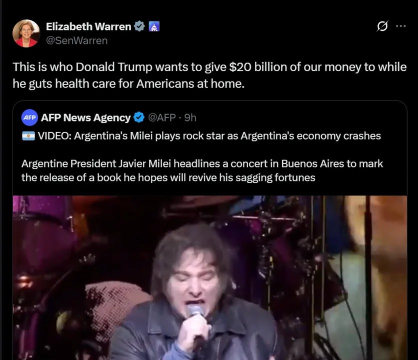 La senadora demócrata Elizabeth Warren cuestionó al presidente de los Estados Unidos, Donald Trump, por el apoyo financiero de US$20.000 millones que le otorgará a Argentina, mostrando un video del presidente Javier Milei durante su show en el Movistar Arena.