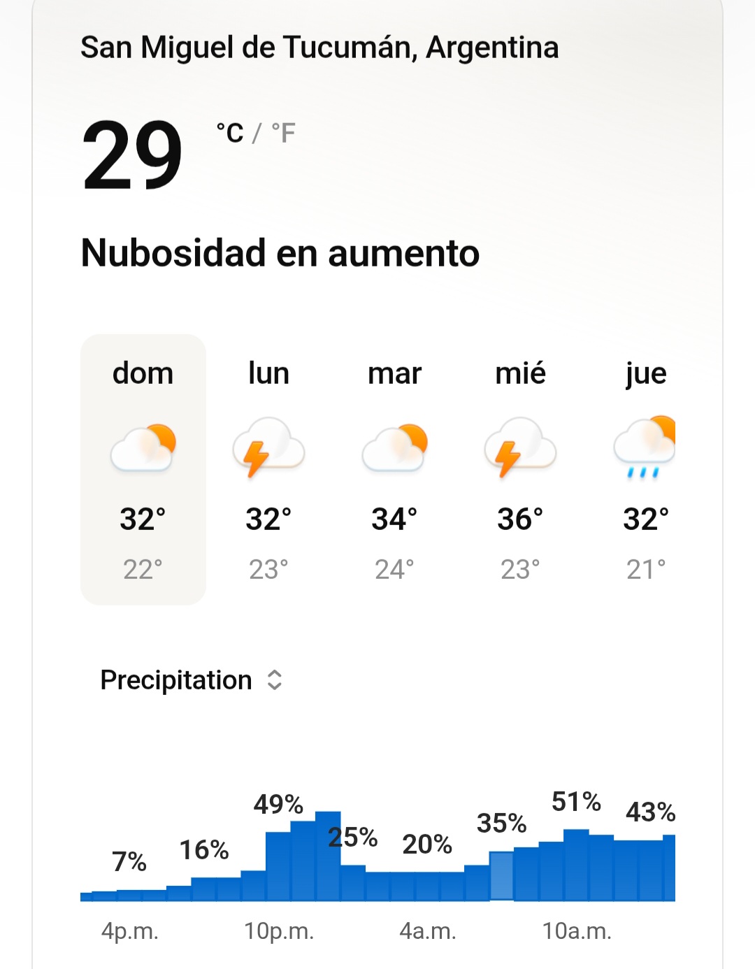 Para la noche del domingo y la madrugada del lunes se espera un aumento marcado en la probabilidad de precipitaciones, con tormentas aisladas que podrían intensificarse en algunos sectores.