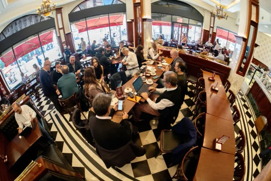 A raíz de las restricciones, la prensa acreditada se dio cita en un reconocido café del centro porteño ubiado a pocos pasos de Plaza de Mayo.