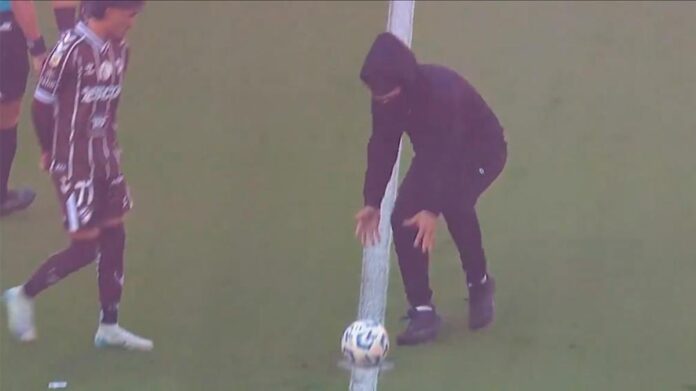 El hombre, vestido completamente de negro y con el rostro cubierto, ingresó desde un lateral del campo de juego, corrió directamente hacia el círculo central y se llevó el balón bajo el brazo, ante la mirada atónita de los jugadores, árbitros y periodistas.