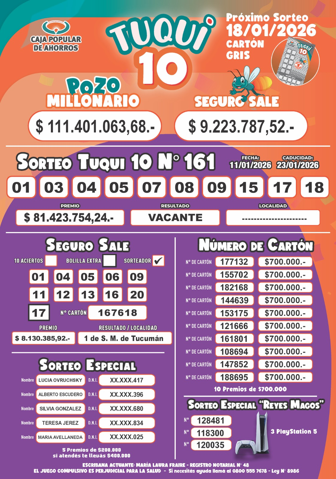 El domingo 11 de enero se realizó el sorteo 161° del Tuqui 10 y el primer premio quedó vacante. Ningún tucumano o tucumana fue el ganador de los $ 81.423.000 que estaban en juego, y el pozo millonario sigue creciendo.