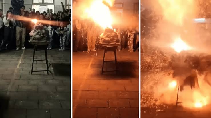 El hecho que conmocionó a la localidad fue grabado por uno de los asistentes y en el video se observa el momento en el que docentes encendieron el artefacto y segundos después explotó, lo que generó corridas y gritos.