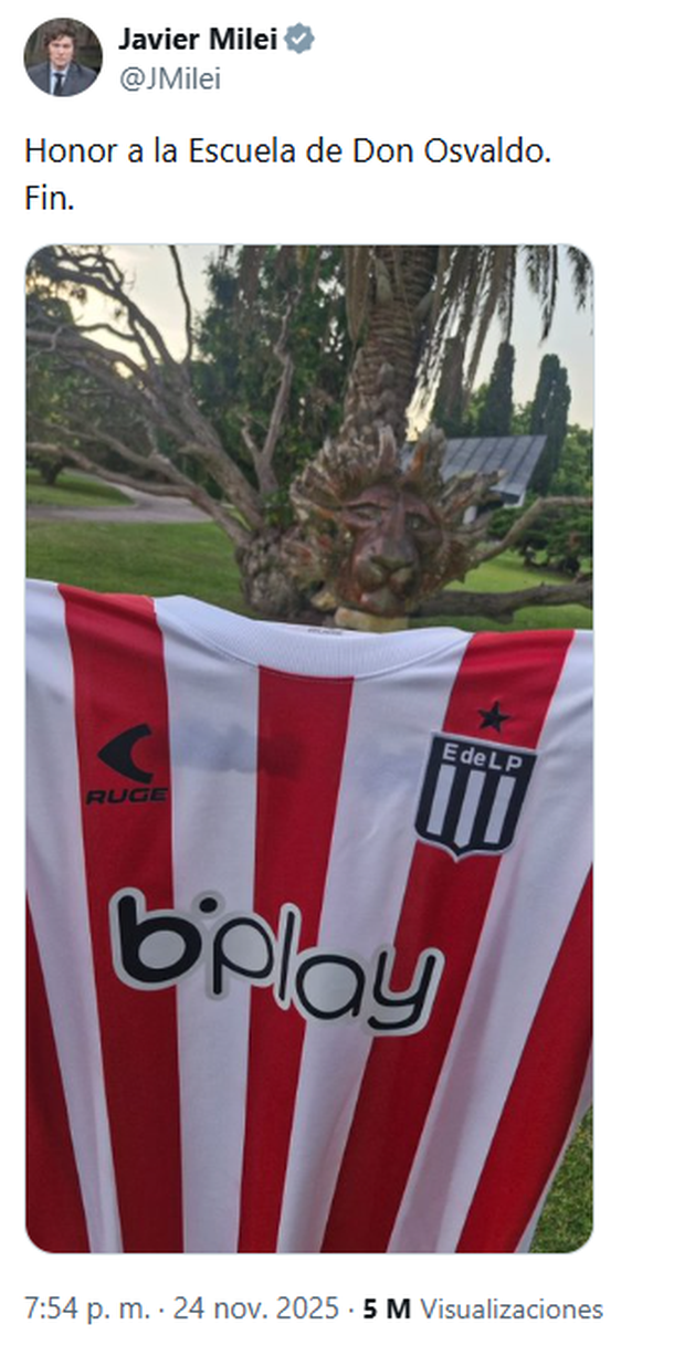 La afinidad del presidente con el club de La Plata no es u4n secreto. Hace poco tiempo, Javier Milei publicó en su cuenta personal una fotografía sosteniendo la camiseta oficial del equipo (de la marca RUGE), con la imponente figura de un león de fondo. «Honor a la Escuela de Don Osvaldo. Fin», escribió el mandatario, en una clara reivindicación a la filosofía de trabajo de Osvaldo Zubeldía, basada en el mérito, la táctica y el esfuerzo.Este fuerte apoyo presidencial se enmarca en la sintonía ideológica que el gobierno mantiene con la gestión de Juan Sebastián Verón. El presidente del club impulsa el ingreso de capitales privados al fútbol argentino mediante un esquema de sociedad mixta, un objetivo clave para el oficialismo en su afán por habilitar las Sociedades Anónimas Deportivas (SAD).