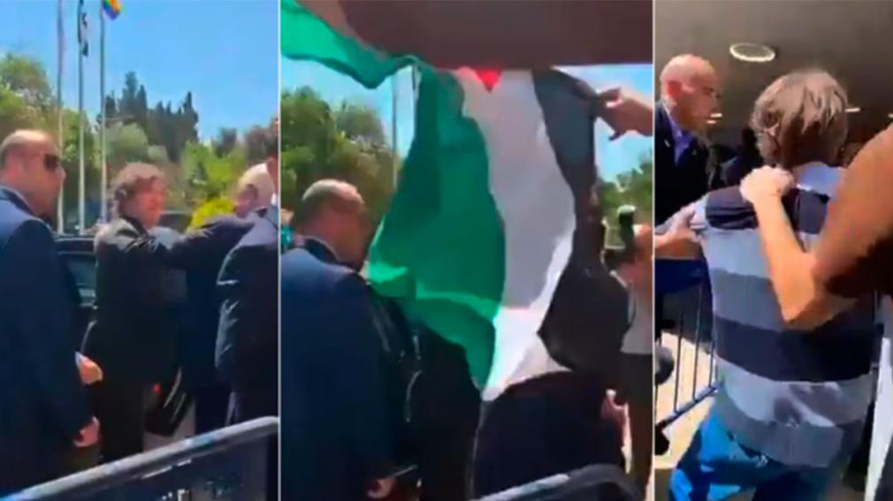 Un hombre que llevaba una bandera de Palestina intentó atacar a Javier Milei en Israel, cuando el Presidente bajaba del auto oficial. “¡Palestina libre!”, se escucha gritar al joven, a la vez que busca saltar el vallado y es interceptado por los custodios.