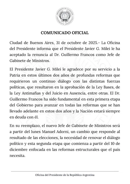 A partir del lunes, el lugar de Francos será ocupado por Manuel Adorni. Según destacaron, la decisión responde al resultado de las elecciones y la necesidad de renovar el diálogo político en esta segunda etapa de gobierno, que comenzará formalmente el 10 de diciembre y estará enfocada en las reformas estructurales que el país demanda.