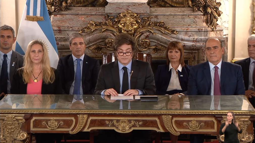 Luego de los anuncios económicos de Luis Caputo y Santiago Bausili de que, entre otras cosas, este lunes se levantará el cepo cambiario, Javier Milei habló por cadena nacional junto a todo su Gabinete para dar un fuerte mensaje político de celebración y agradecer al Fondo Monetario Internacional y otros organismos por el respaldo económico.