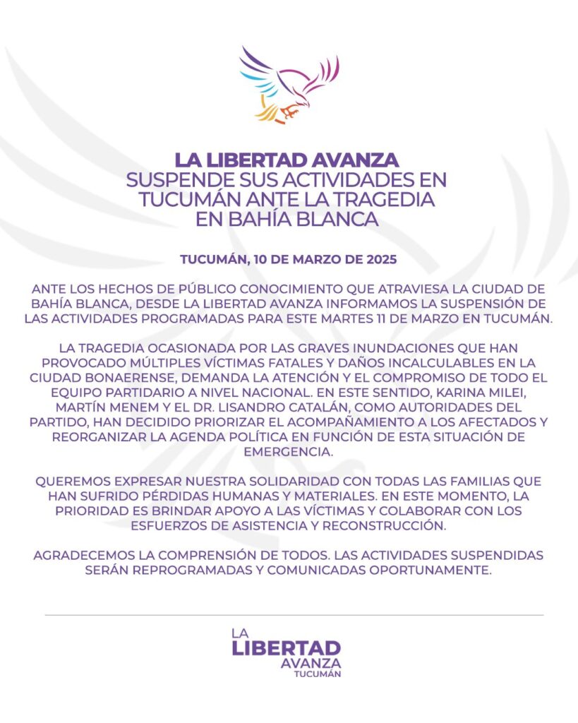 Sin embargo, por la tarde de este lunes, desde La Libertad Avanza se comunicó que, “ante los hechos de público conocimiento que atraviesa la ciudad de Bahía Blanca”, se optó por suspender “las actividades programadas para este martes 11 de marzo en Tucumán”.