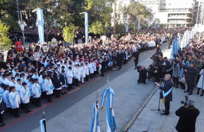 En el marco del Día de la Bandera Nacional, fecha en la que se conmemora el 205° aniversario del fallecimiento del general, Manuel Belgrano, en la explanada de la Casa de Gobierno de Tucumán, el gobernador, Osvaldo Jaldo, tomó la promesa de lealtad a la insignia patria a 3.300 alumnos de 4° de escuelas públicas y privadas, y más 40 estudiantes adultos, pertenecientes a más de 60 escuelas de toda la provincia.