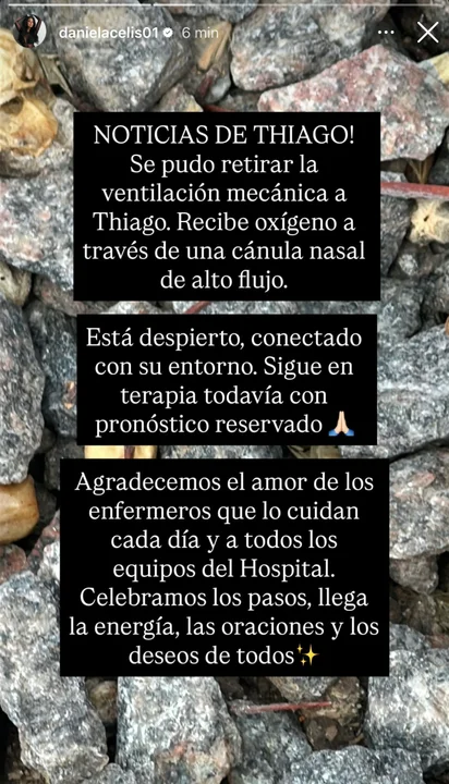 “Es un proceso largo, puede tener altos y bajos pero la fe, las esperanzas y oraciones que no dejen de faltar hasta que esté 100% bien y pueda salir del hospital. Estoy muy feliz. Lo primero que hizo fue preguntarme por las nenas”, cerró Daniela Celis.