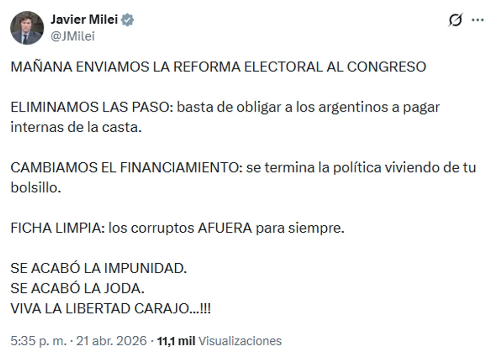A través de un mensaje en redes sociales, el mandatario sostuvo que la iniciativa busca “terminar con la impunidad” y cuestionó el actual sistema electoral al afirmar que “basta de obligar a los argentinos a pagar internas de la casta”.