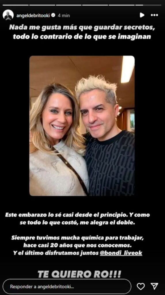 Además, en otra foto junto a la ex vedette, expresó: «Nada me gusta más que guardar secretos, todo lo contrario a lo que se imaginan. Este embarazo lo sé casi desde el principio, y como se todo lo que costó me alegra el doble. Siempre tuvimos mucha química para trabajar. Hace casi 20 años que nos conocemos. Y el último que disfrutamos juntos fue Bondi Live. Te quiero Ro«.