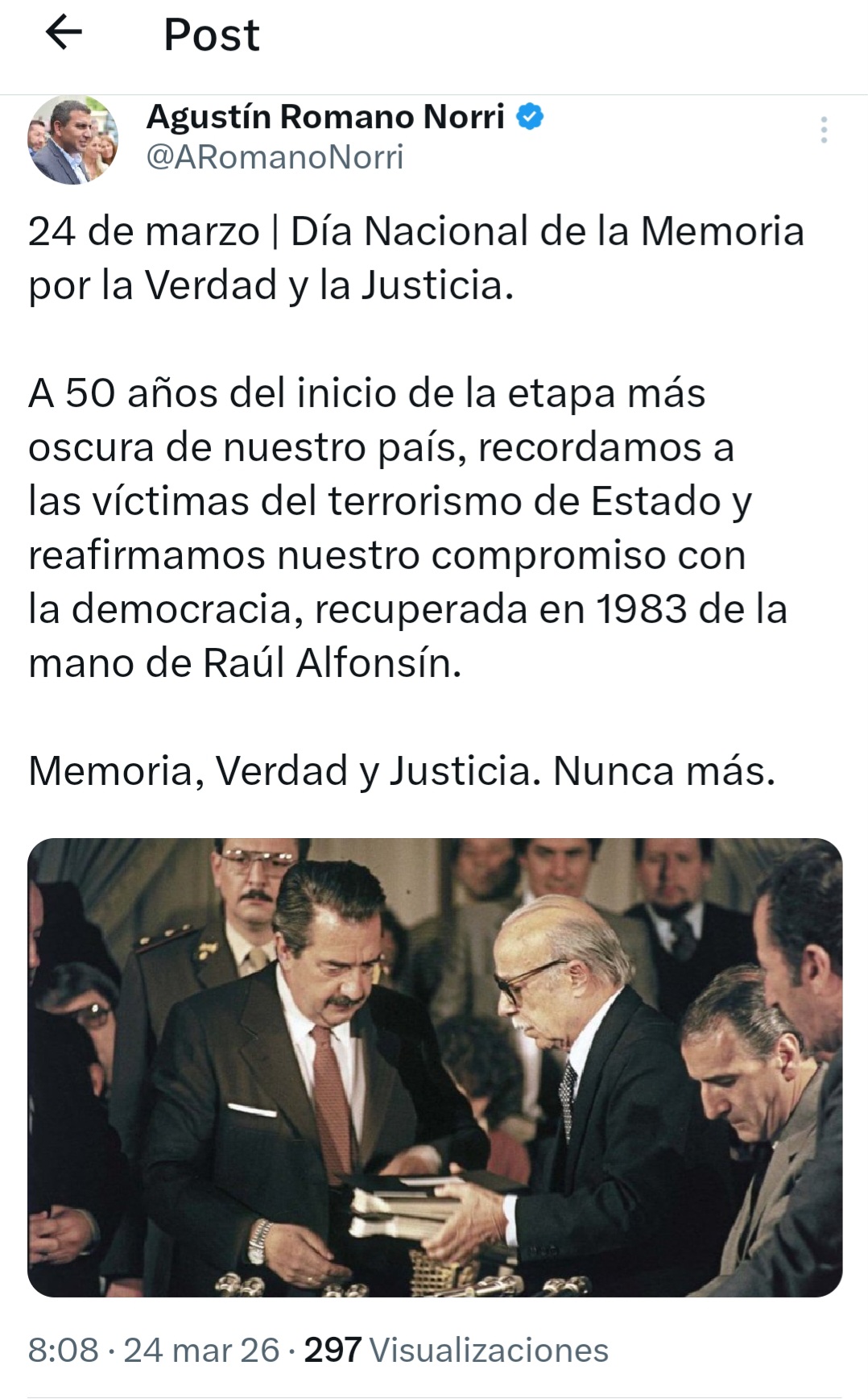 En el marco del Día Nacional de la Memoria por la Verdad y la Justicia, el legislador Agustín Romano Norri publicó un mensaje en sus redes sociales en el que recordó a las víctimas del terrorismo de Estado y ratificó su compromiso con el sistema democrático.