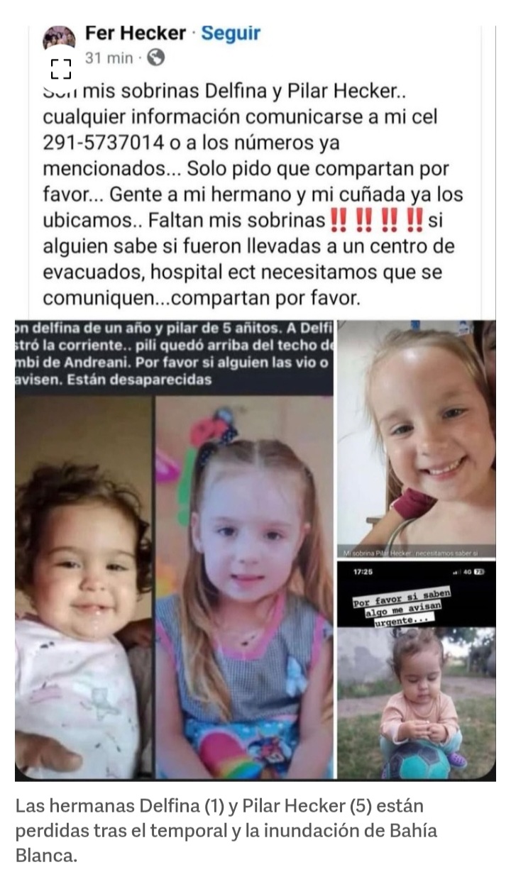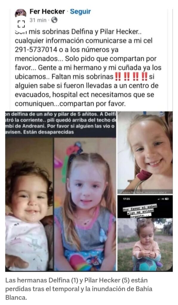“Son mis sobrinas Delfina y Pilar Hecker.. cualquier información comunicarse a mi cel 291-5737014 o a los números ya mencionados… Solo pido que compartan por favor… Gente, a mi hermano y a mi cuñada ya los ubicamos.. Faltan mis sobrinas, si alguien sabe si fueron llevadas a un centro de evacuados, hospital, etc necesitamos que se comuniquen…compartan por favor”, alertó con desesperación su tío, Fernando Hecker, en Facebook.