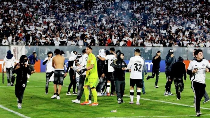 El caos estalló cuando miembros de la barra brava de Colo-Colo, conocida como La Garra Blanca, invadieron el campo de juego al grito de: “Venganza. Dos vidas valen más que tres puntos”. El partido estaba igualado sin goles y fue inmediatamente suspendido. Mientras los jugadores de Fortaleza corrieron hacia los vestuarios, los dirigidos por Jorge Almirón intentaron calmar la situación.