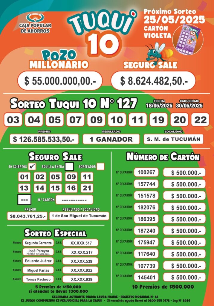 Este domingo 18 de mayo se realizó el sorteo 127° del Tuqui 10 y un apostador se llevó el pozo millonario de $ 126,5 millones. Se supo que el afortunado ganador es de San Miguel de Tucumán.