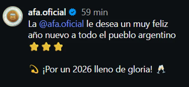 “La AFA le desea un muy feliz año nuevo a todo el pueblo argentino. ¡Por un 2026 lleno de gloria!”, fue el mensaje publicado por la cuenta oficial de la entidad que rige el fútbol nacional, acompañado por imágenes alusivas a los recientes logros de las selecciones argentinas.