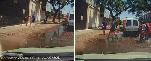 El conductor de la camioneta desciende del vehículo y ambos hombres se enfrentan a los gritos, hasta que la discusión deriva en golpes.