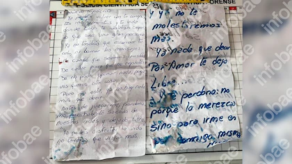 Los forenses encontraron dos papeles de fondo liso, del tamaño de un anotador, cuando revisaron a la mujer que mató a su hijo de 6 años y se suicidó en Florencio Varela. En la foto a la que pudo acceder Infobae, se ve que están algo arrugados y pareciera que se mojaron, porque hay alguna que otra parte borroneada de la carta que dejó la filicida. Tienen su firma y van dirigidos al padre de la víctima, pareja de la asesina.